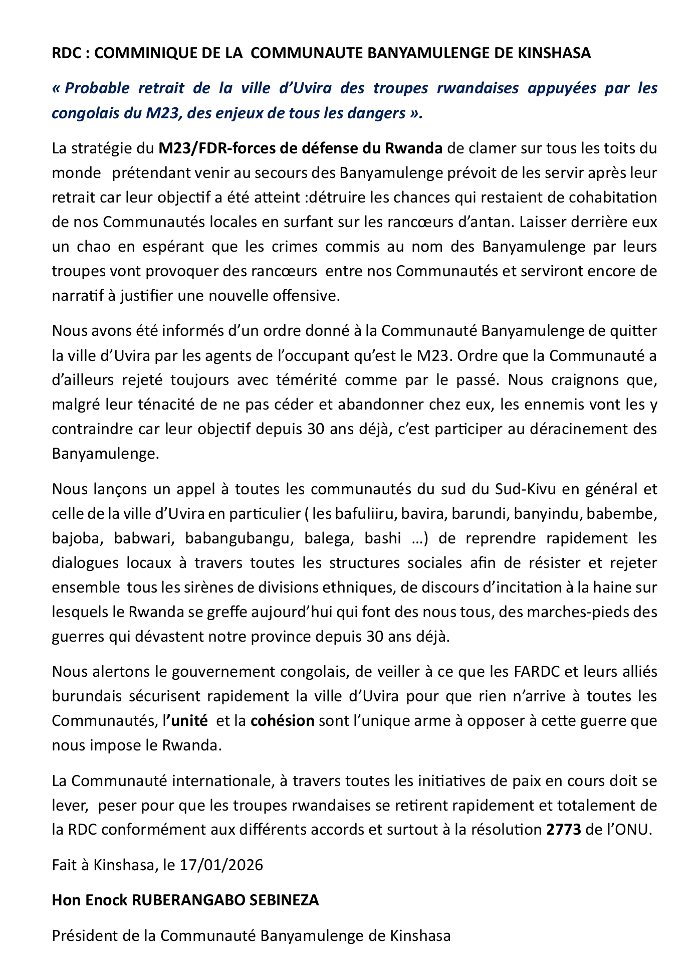 Selon ce document, des émissaires rwandais auraient réuni les membres de la communauté à l’Église Méthodiste de Nyamyanda, à Uvira, pour leur signifier un ultimatum sans appel : quitter le territoire d’Uvira avant le dimanche 18 janvier 2026 à 10h00. Le motif invoqué par les agents rwandais ? Une menace imminente des groupes « Wazalendo » et de l’armée burundaise.