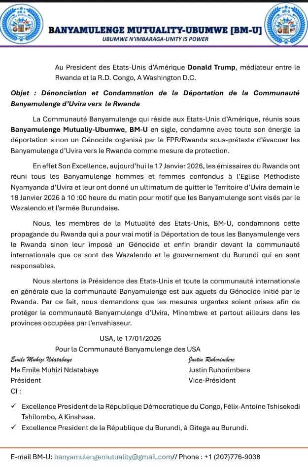 Le document le plus alarmant provient de la « Banyamulenge Mutuality-Ubumwe (BM-U) », basée aux États-Unis.