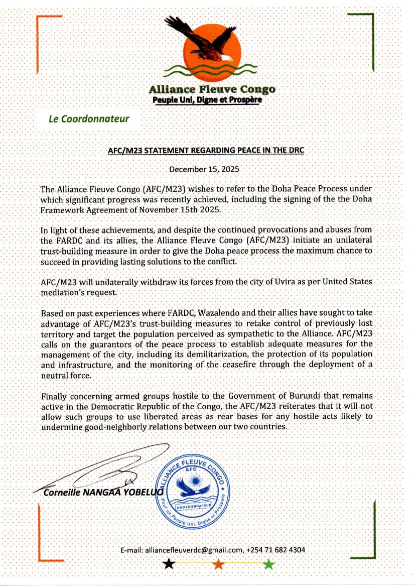 Tout a commencé par la diffusion d’un communiqué officiel signé par Corneille Nangaa, coordonnateur de l’AFC. Ce document, qui a surpris de nombreux observateurs, ordonne le retrait des troupes rebelles de la ville d’Uvira, conquise il y a seulement quelques jours.